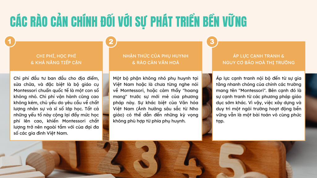 Áp lực cạnh tranh nội bộ đến từ sự gia tăng nhanh chóng của chính các trường mang tên “Montessori”. Sự bùng nổ này, đặc biệt ở phân khúc giá rẻ và tầm trung, tạo ra một thị trường đông đúc và phân mảnh, nơi các trường phải cạnh tranh gay gắt để tuyển sinh.21