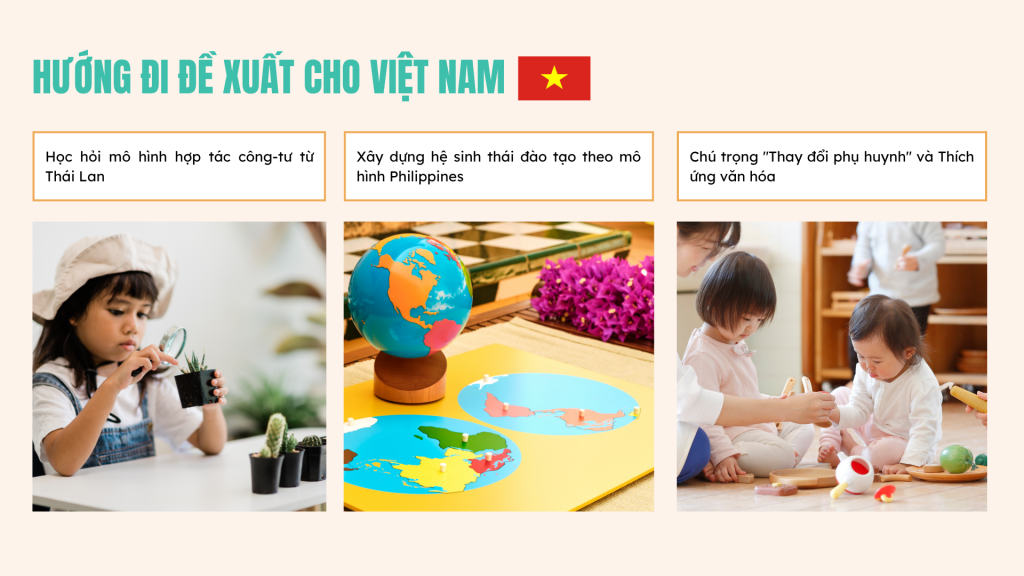 - Chú trọng “Thay đổi phụ huynh” và Thích ứng văn hóa: Cả Thái Lan và Philippines đều cho thấy tầm quan trọng của việc xây dựng lòng tin và sự thấu hiểu từ phụ huynh. Các trường tại Việt Nam cần đầu tư mạnh mẽ hơn vào việc truyền thông về triết lý, không chỉ là quảng cáo. Đồng thời, việc chủ động nghiên cứu và “Việt hóa” các học cụ, bài học (như cách Philippines lồng ghép di sản văn hóa) sẽ giúp phương pháp này bén rễ sâu hơn vào xã hội.