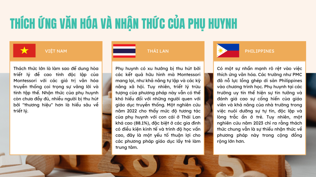 - Thái Lan: Phụ huynh có xu hướng bị thu hút bởi các kết quả hữu hình mà Montessori mang lại, như khả năng tự lập và các kỹ năng xã hội (ví dụ: trẻ biết cách ngắt lời một cách lịch sự).68 Tuy nhiên, triết lý trừu tượng của phương pháp này vẫn có thể khó hiểu đối với những người quen với giáo dục truyền thống.68 Một nghiên cứu năm 2022 cho thấy mức độ tương tác của phụ huynh với con cái ở Thái Lan khá cao (88.1%), đặc biệt ở các gia đình có điều kiện kinh tế và trình độ học vấn cao, đây là một yếu tố thuận lợi cho các phương pháp giáo dục lấy trẻ làm trung tâm.69