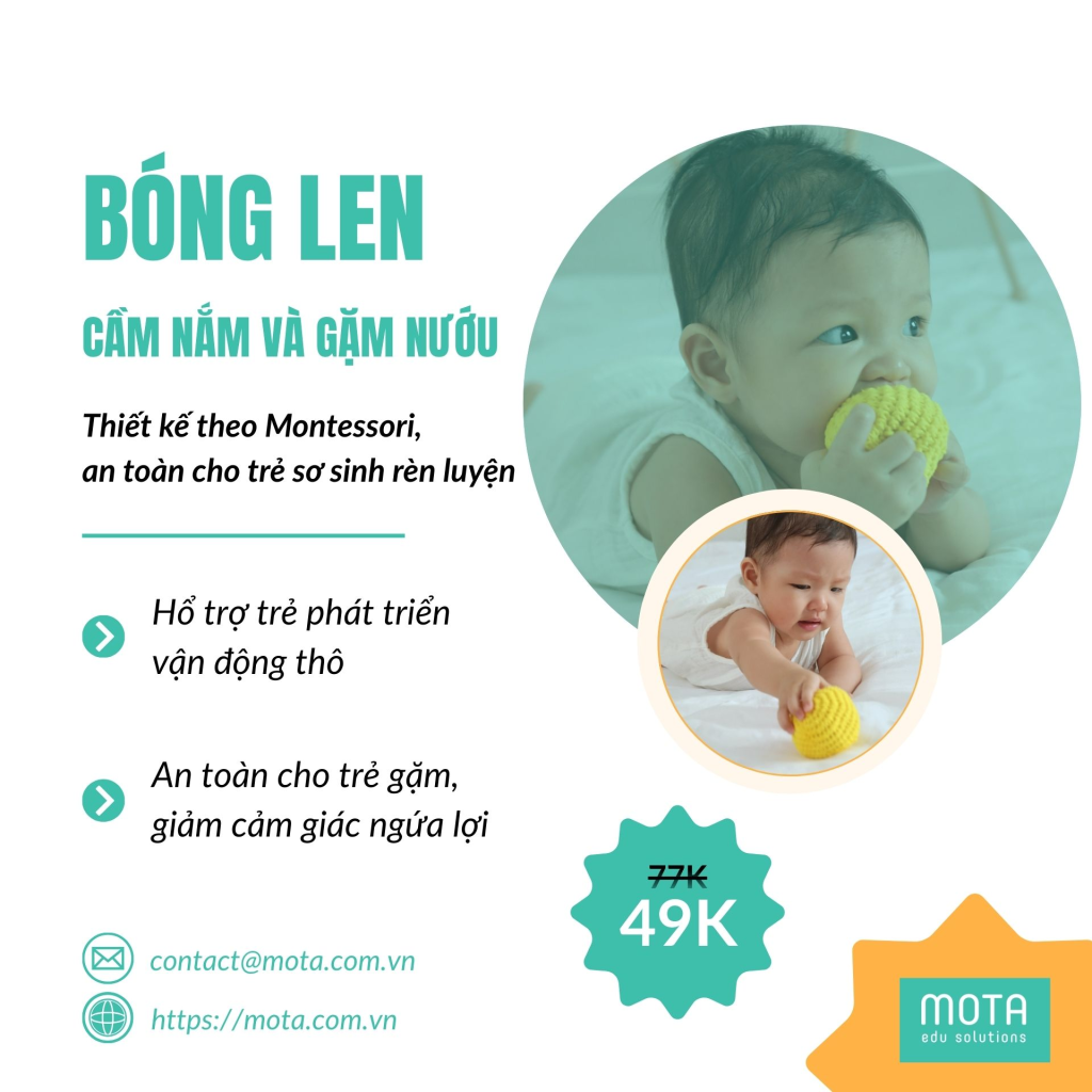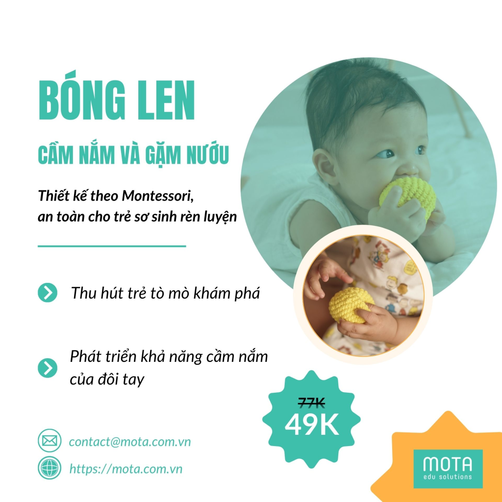 Ba mẹ có biết điều này không? Giai đoạn sơ sinh vô cùng quan trọng. Đây là thời điểm vàng của con. Bé khám phá thế giới qua đôi tay. Khuôn miệng cũng giúp bé học hỏi. Bóng len Montessori là người bạn lý tưởng. Sản phẩm được thiết kế rất chuẩn mực. MOTA mang đến món đồ chơi an toàn. Nó đồng hành cùng trẻ mỗi ngày.