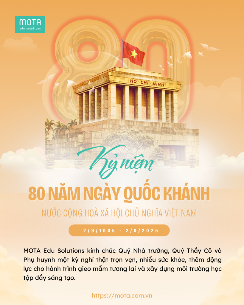 🌟 Nhân ngày lễ trọng đại này, MOTA Edu Solutions xin trân trọng gửi lời chúc đến Quý Nhà trường, Quý Thầy Cô và Phụ huynh một kỳ nghỉ lễ Quốc khánh thật nhiều sức khỏe, hạnh phúc và ý nghĩa bên tập thể, đồng nghiệp và gia đình 🎊
