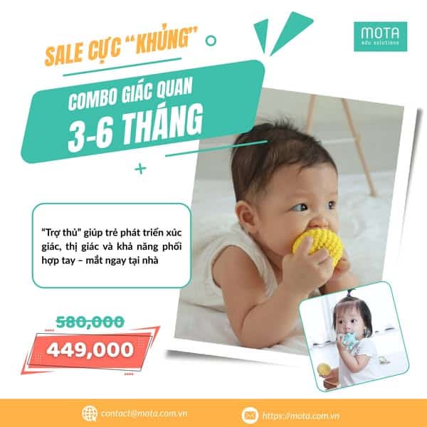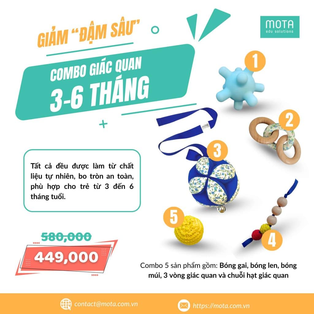 Combo giác quan MOTA 3-6 tháng chính là “trợ thủ” giúp trẻ phát triển xúc giác, thị giác và khả năng phối hợp tay – mắt ngay tại nhà.