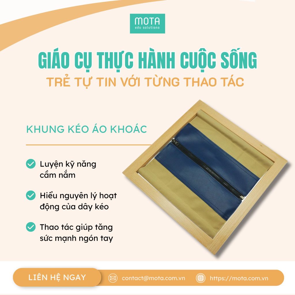 Khung kéo dây áo khoác: Trẻ luyện kỹ năng cầm nắm và kéo khóa từ dưới lên, hiểu nguyên lý hoạt động của dây kéo. Hoạt động này tăng sức mạnh ngón tay và giúp trẻ tự tin khi mặc áo khoác.