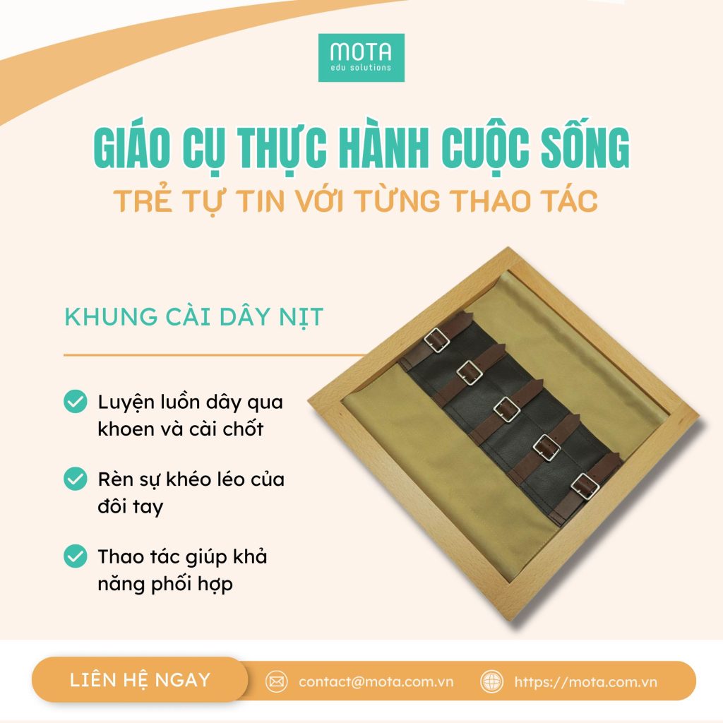 Khung cài dây nịt: Trẻ luyện cách luồn dây qua khoen và cài chốt cố định đúng vị trí. Hoạt động này rèn sự khéo léo của đôi tay, khả năng phối hợp và tính kiên nhẫn khi mặc trang phục.