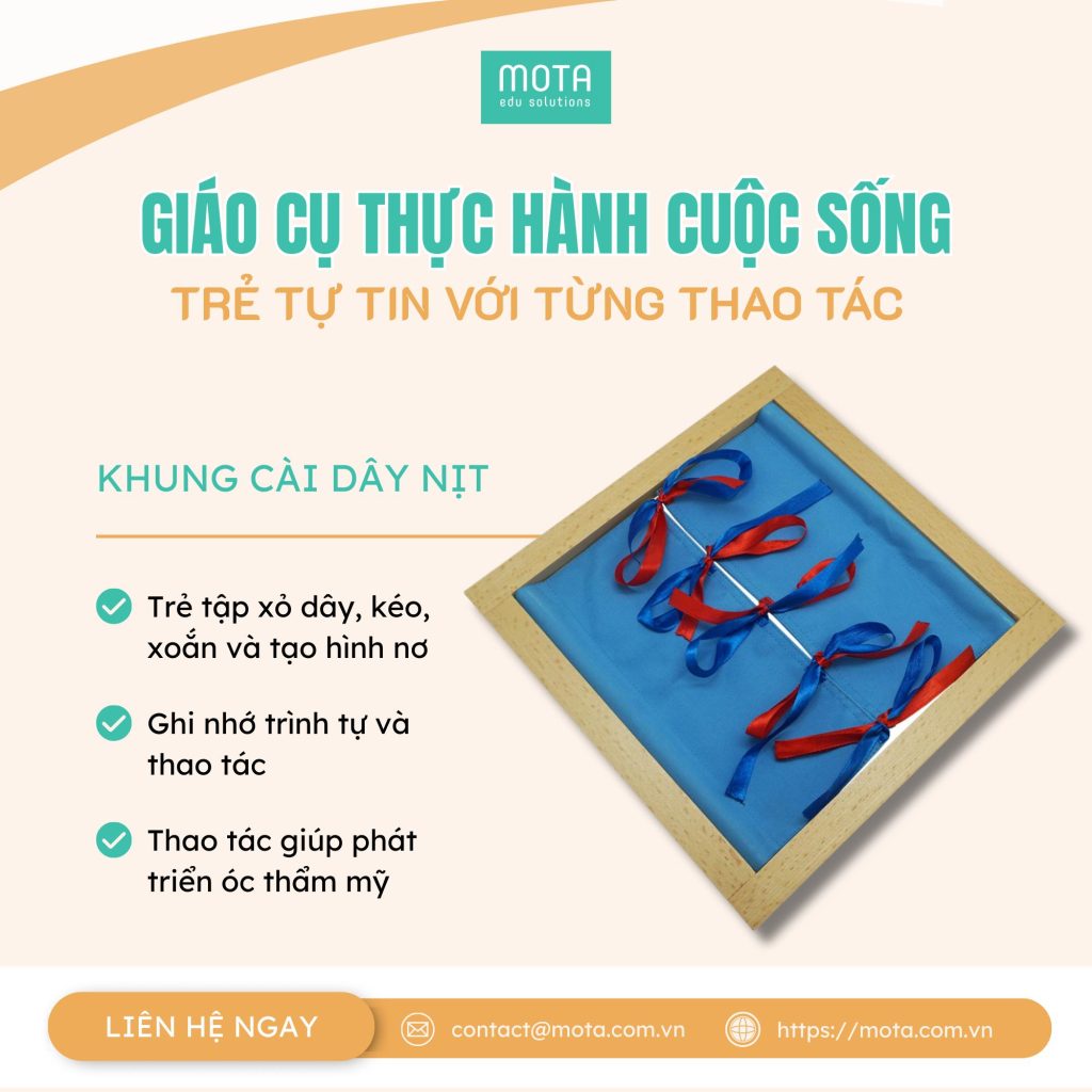 Khung thắt nơ: Trẻ tập xỏ dây, kéo, xoắn và tạo hình nơ một cách gọn gàng. Việc thực hành thường xuyên giúp trẻ ghi nhớ trình tự thao tác và phát triển óc thẩm mỹ.