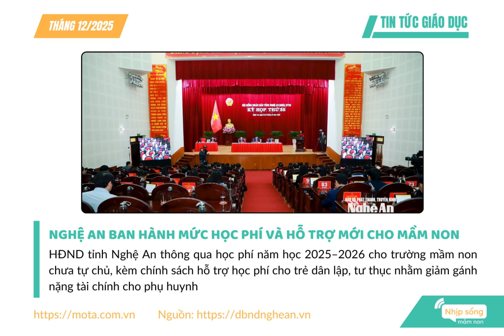 HĐND tỉnh Nghệ An thông qua học phí năm học 2025–2026 cho trường mầm non chưa tự chủ, kèm chính sách hỗ trợ học phí cho trẻ dân lập, tư thục nhằm giảm gánh nặng tài chính cho phụ huynh.