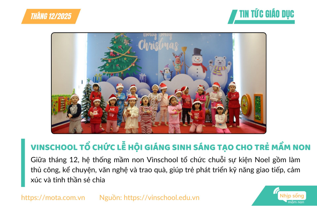 Giữa tháng 12, hệ thống mầm non Vinschool tổ chức chuỗi sự kiện Noel gồm làm thủ công, kể chuyện, văn nghệ và trao quà, giúp trẻ phát triển kỹ năng giao tiếp, cảm xúc và tinh thần sẻ chia.