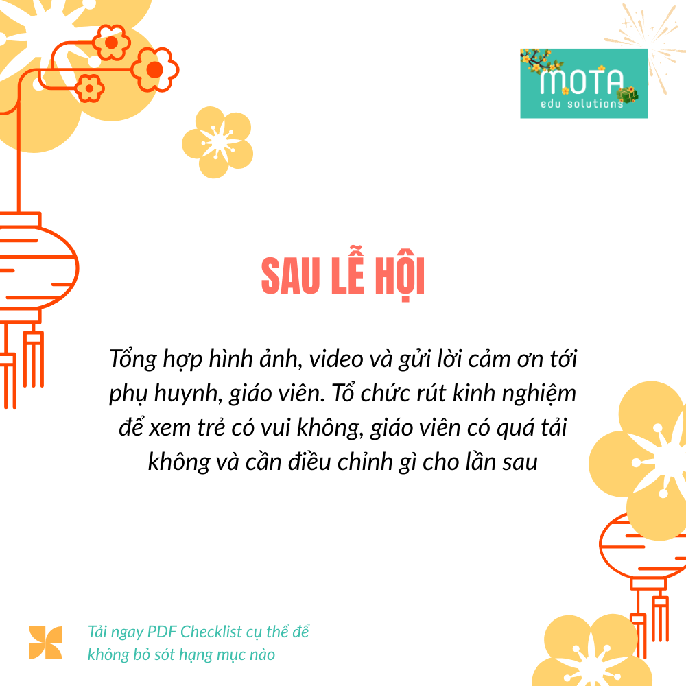 MOTA Edu Solutions đã tổng hợp Checklist tổ chức Lễ hội Xuân mầm non từ kinh nghiệm triển khai thực tế ở nhiều trường ngắn gọn, Quý Thầy Cô tải checklist tại đây và lưu lại cho mùa Xuân này nhé!