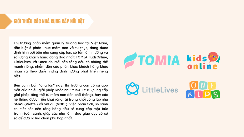 Thị trường phần mềm quản lý trường học tại Việt Nam, đặc biệt ở phân khúc mầm non và tư thục, đang được định hình bởi bốn nhà cung cấp lớn, có tầm ảnh hưởng và số lượng khách hàng đông đảo nhất: TOMIA, KidsOnline, LittleLives, và OneKids. Mỗi nền tảng đều có những thế mạnh riêng, nhắm đến các phân khúc khách hàng khác nhau và theo đuổi những định hướng phát triển riêng biệt. Bên cạnh bốn “ông lớn” này, thị trường còn có sự góp mặt của nhiều giải pháp khác như MISA EMIS (cung cấp giải pháp tổng thể từ mầm non đến phổ thông), hay các hệ thống được triển khai rộng rãi trong khối công lập như SMAS (Viettel) và vnEdu (VNPT). Việc phân tích, so sánh chi tiết các nền tảng hàng đầu sẽ cung cấp một bức tranh toàn cảnh, giúp các nhà lãnh đạo giáo dục có cơ sở để đưa ra lựa chọn phù hợp nhất.