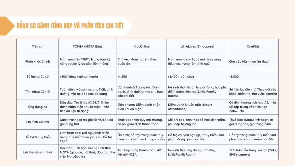- TOMIA: Nền tảng này định vị mình là một “kẻ thách thức toàn diện” (comprehensive challenger). Mặc dù ra mắt sau các đối thủ, TOMIA đã nhanh chóng khẳng định vị thế nhờ ba yếu tố khác biệt. Thứ nhất là công nghệ vượt trội, đặc biệt là việc tích hợp sâu Trí tuệ Nhân tạo (AI), với Trợ lý ảo AI hỗ trợ 24/7 là tính năng độc nhất trên thị trường hiện nay. Thứ hai là khả năng phục vụ đa cấp học, từ mầm non đến THPT và cả trung tâm kỹ năng, đáp ứng nhu cầu của các hệ thống trường liên cấp muốn quản lý trên một nền tảng duy nhất. Thứ ba và quan trọng nhất là lợi thế cạnh tranh độc đáo đến từ hệ sinh thái MOTA Edu Solutions, cho phép tích hợp phần mềm với các dịch vụ khác như giáo cụ, nội thất, đào tạo giáo viên và thư viện số, tạo ra một giải pháp “all-in-one” thực sự cho các cơ sở giáo dục.