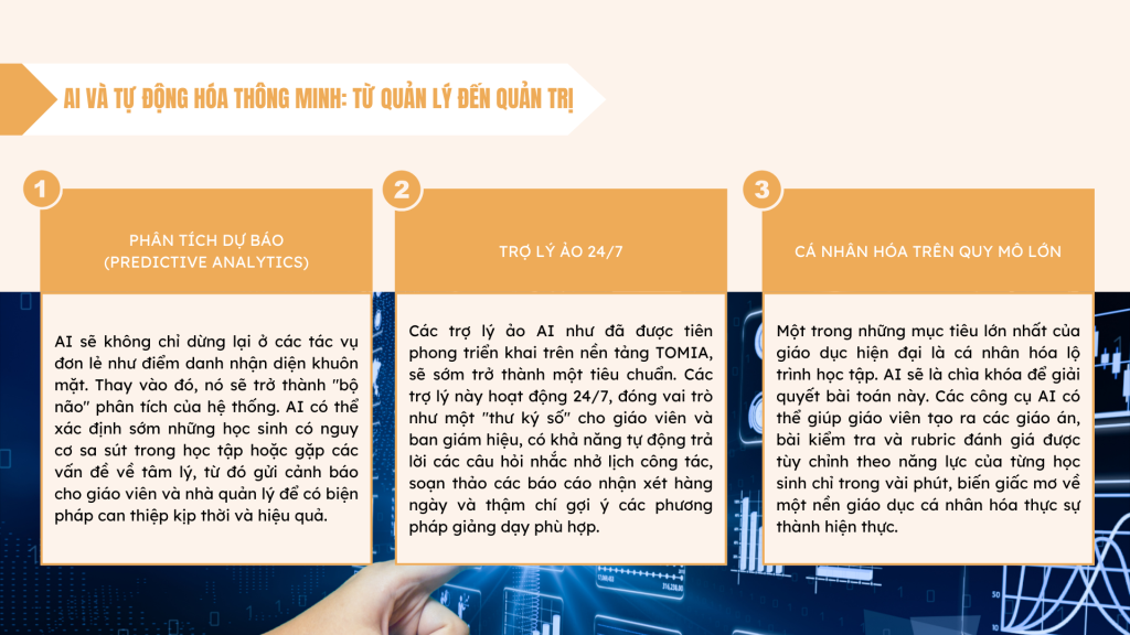 - Trợ lý ảo 24/7: Các trợ lý ảo AI, như đã được tiên phong triển khai trên nền tảng TOMIA, sẽ sớm trở thành một tiêu chuẩn của ngành. Các trợ lý này hoạt động 24/7, đóng vai trò như một “thư ký số” cho giáo viên và ban giám hiệu, có khả năng tự động trả lời các câu hỏi thường gặp của phụ huynh qua chatbot, nhắc nhở lịch công tác, soạn thảo các báo cáo nhận xét hàng ngày, và thậm chí gợi ý các phương pháp giảng dạy phù hợp. Công nghệ này hứa hẹn sẽ định nghĩa lại khái niệm năng suất trong ngành giáo dục, giải phóng con người khỏi những tác vụ lặp đi lặp lại để tập trung vào các công việc đòi hỏi sự sáng tạo và tương tác sâu.