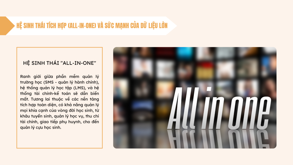 - Hệ sinh thái “All-in-One”: Ranh giới giữa phần mềm quản lý trường học (SMS – quản lý hành chính), hệ thống quản lý học tập (LMS), và hệ thống tài chính-kế toán sẽ dần biến mất. Tương lai thuộc về các nền tảng tích hợp toàn diện, có khả năng quản lý mọi khía cạnh của vòng đời học sinh, từ khâu tuyển sinh, quản lý học vụ, thu chi tài chính, giao tiếp phụ huynh, cho đến quản lý cựu học sinh.