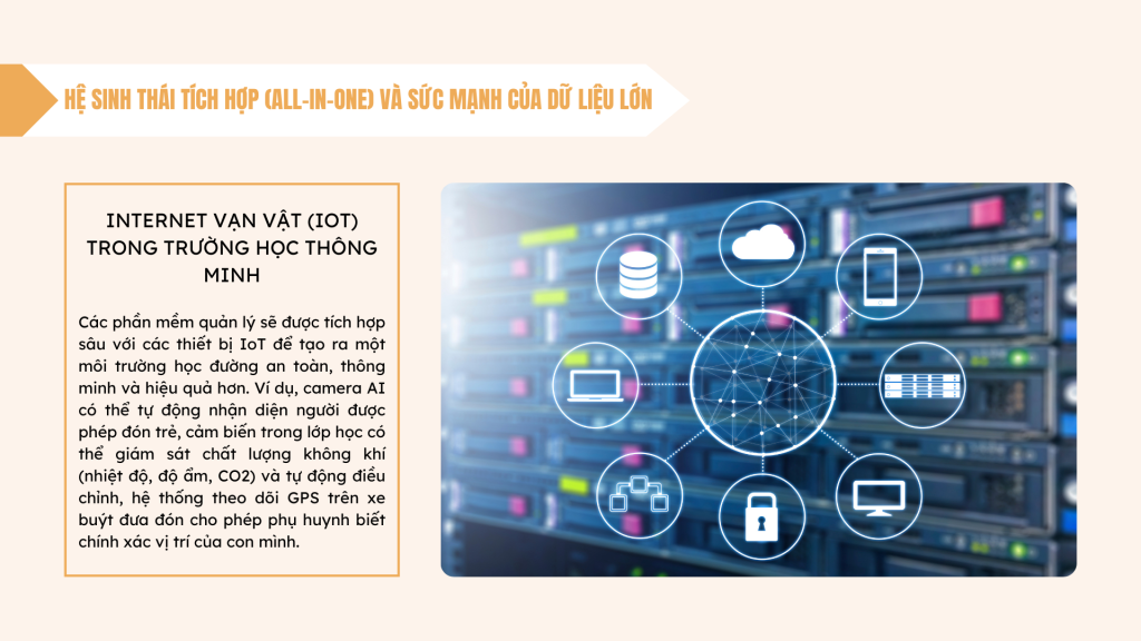 - Internet vạn vật (IoT) trong Trường học Thông minh: Các phần mềm quản lý sẽ được tích hợp sâu với các thiết bị IoT để tạo ra một môi trường học đường an toàn, thông minh và hiệu quả hơn. Ví dụ, camera AI có thể tự động nhận diện người được phép đón trẻ, cảm biến trong lớp học có thể giám sát chất lượng không khí (nhiệt độ, độ ẩm, CO2) và tự động điều chỉnh, hệ thống theo dõi GPS trên xe buýt đưa đón cho phép phụ huynh biết chính xác vị trí của con mình, giảm thiểu thời gian chờ đợi và các rủi ro an toàn.