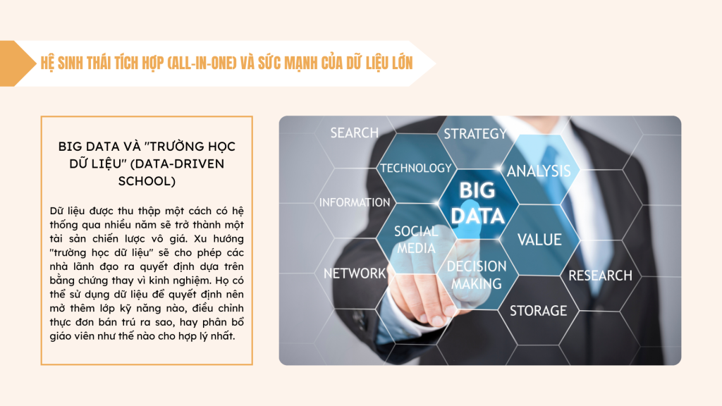 - Big Data và “Trường học Dữ liệu” (Data-Driven School): Dữ liệu được thu thập một cách có hệ thống qua nhiều năm (dữ liệu điểm danh, thành tích học tập, phản hồi phụ huynh, chi tiêu tài chính…) sẽ trở thành một tài sản chiến lược vô giá. Xu hướng “trường học dữ liệu” sẽ cho phép các nhà lãnh đạo ra quyết định dựa trên bằng chứng thay vì kinh nghiệm. Họ có thể sử dụng dữ liệu để quyết định nên mở thêm lớp kỹ năng nào, điều chỉnh thực đơn bán trú ra sao, hay phân bổ giáo viên như thế nào cho hợp lý nhất.