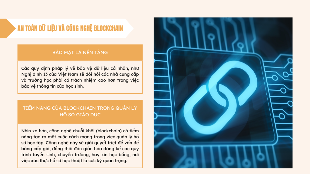 - Tiềm năng của Blockchain trong Quản lý Hồ sơ Giáo dục: Nhìn xa hơn, công nghệ chuỗi khối (blockchain) có tiềm năng tạo ra một cuộc cách mạng trong việc quản lý hồ sơ học tập. Bằng cách lưu trữ các văn bằng, chứng chỉ, và bảng điểm trên một sổ cái phân tán, blockchain có thể tạo ra các hồ sơ học tập điện tử minh bạch, không thể giả mạo và có thể được xác minh trên toàn cầu. Công nghệ này sẽ giải quyết triệt để vấn đề bằng cấp giả, đồng thời đơn giản hóa đáng kể các quy trình tuyển sinh, chuyển trường, hay xin học bổng, nơi việc xác thực hồ sơ học thuật là cực kỳ quan trọng.