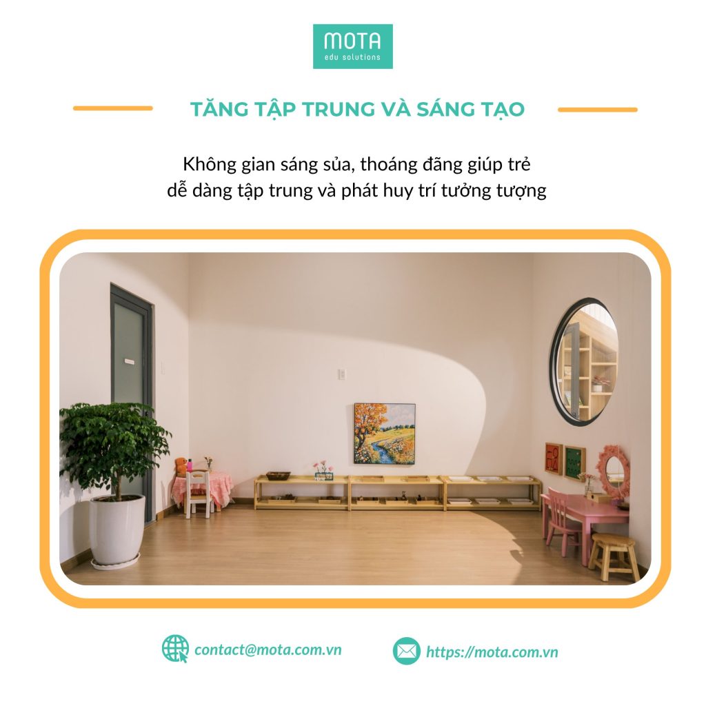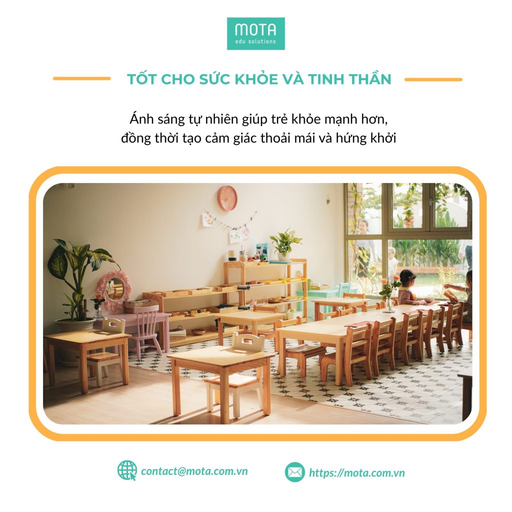 Ánh sáng tự nhiên hỗ trợ hấp thụ vitamin D, giúp trẻ khỏe mạnh hơn, đồng thời tạo cảm giác thoải mái và hứng khởi trong các hoạt động học tập.