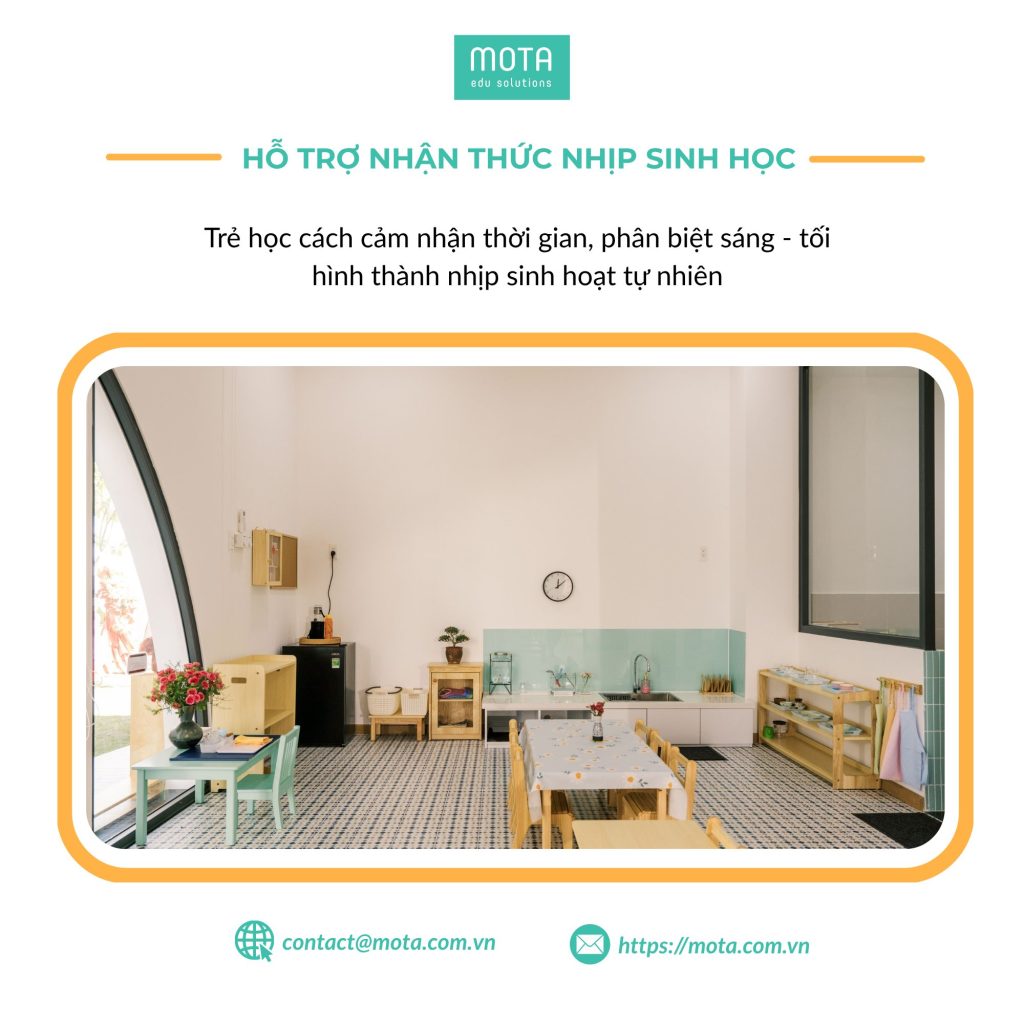 Trẻ học cách cảm nhận thời gian, phân biệt sáng – tối, từ đó hình thành nhịp sinh hoạt tự nhiên và nhận thức về môi trường xung quanh.