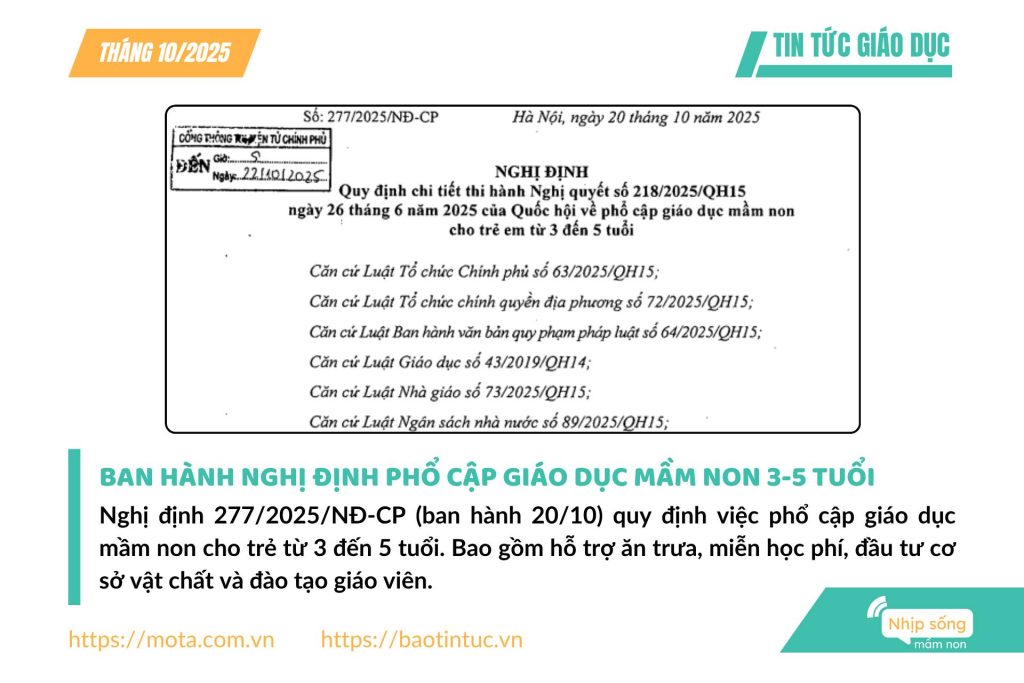 Nghị định 277/2025/NĐ-CP (ban hành 20/10) quy định việc phổ cập giáo dục mầm non cho trẻ từ 3 đến 5 tuổi.