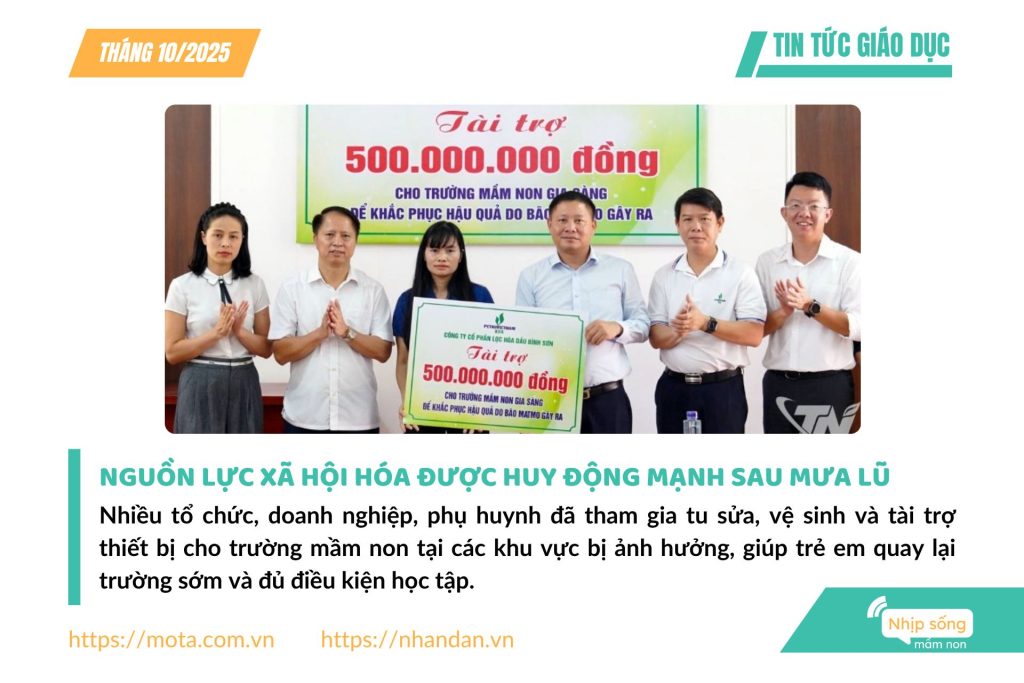 Nhiều tổ chức, doanh nghiệp, phụ huynh đã tham gia tu sửa, vệ sinh và tài trợ thiết bị cho trường tại các khu vực bị ảnh hưởng, giúp trẻ em quay lại trường sớm và đủ điều kiện học tập.