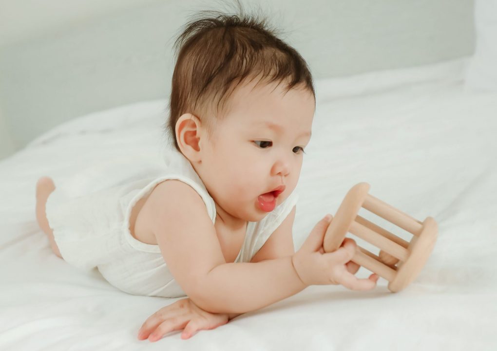 Khi bé bắt lấy thành công rồi, bé sẽ bắt đầu quá trình khám phá bằng các giác quan của mình (thị giác, thính giác, xúc giác). Bé sẽ thử làm với nhiều cách nhất có thể: bắt đầu chuyển động từ các ngón tay đến cổ tay, cầm lắc và thậm chí là gặm,…