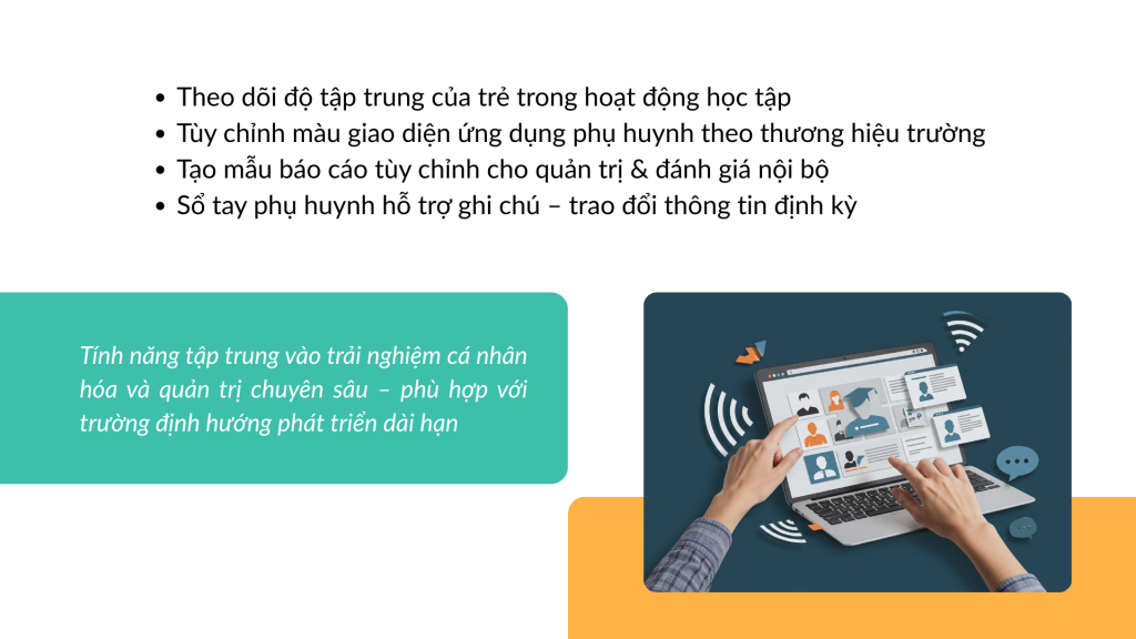 Những tính năng này không phải là yếu tố bắt buộc đối với mọi trường mầm non, nhưng có thể trở thành lợi thế đối với các đơn vị có nhu cầu quản lý chi tiết và cá nhân hóa cao.
