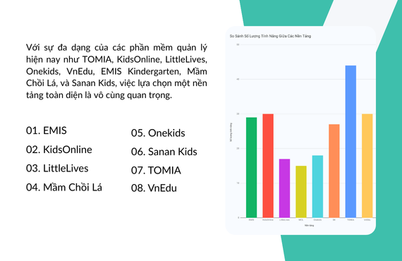 Trong kỷ nguyên số, việc ứng dụng công nghệ vào quản lý và giảng dạy tại các trường mầm non ngày càng trở thành một yêu cầu thiết yếu nhằm nâng cao chất lượng dịch vụ và tối ưu hóa vận hành. Trên thị trường hiện nay, nhiều phần mềm quản lý được sử dụng rộng rãi như TOMIA, KidsOnline, LittleLives, Onekids, VnEdu, EMIS Kindergarten, Mầm Chồi Lá và Sanan Kids.